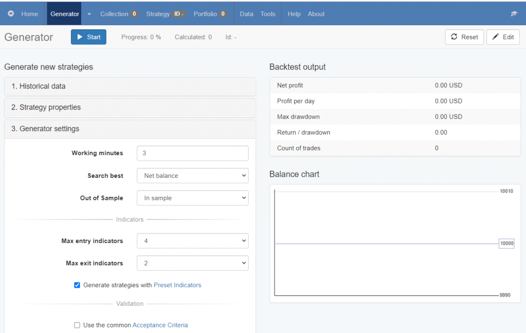 When the Generator's option “The strategies use Preset Indicators” is enabled, each newly generated strategy starts with the preset indicators.